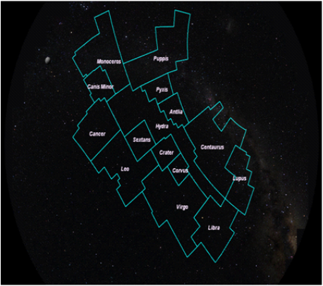 A trapezoid of stars marks one of the serpent’s ‘seven heads’. These are Delta Hydrae. Epsilon Hydrae, Zeta Hydrae,