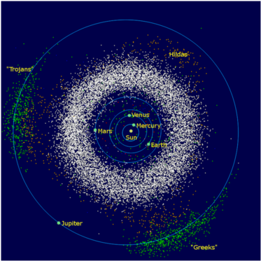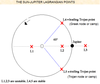 distance from the Sun) put them opposite Jupiter, or 60 degrees ahead of or behind Jupiter at the L4 and L5 Lagrangian